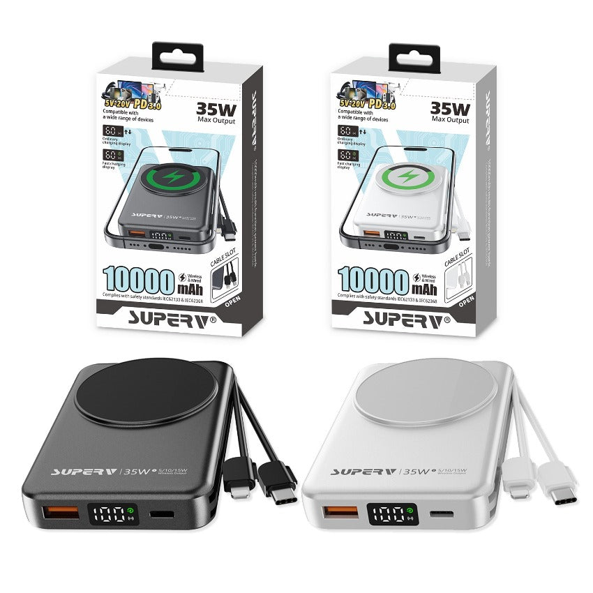MODEL: POWER11兩種顏色選擇:黑色/白色🔋手機Magsafe 無線充🔋自帶雙線TypeC + Lightning🔋可5台裝置同時充電🔋15W Magsafe無線輸出🔋雙input和output,PD35W TypeC Output🔋10000mAh大電量,可滿足日常需求🔋設有LED電量顯示屏🔋設有手機支架功能